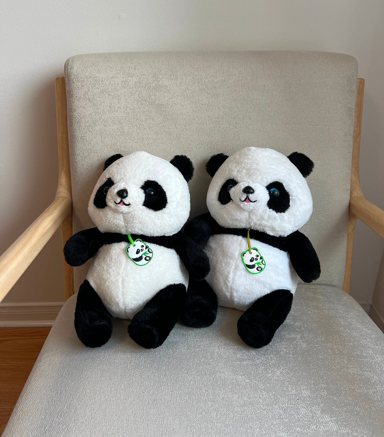 I also bought some cute panda soft toys online to give to my friends in Canada. Look at these two pandas — aren’t they adorable? But I think the one I bought is a bit too big. Next time, I want to get a smaller one.