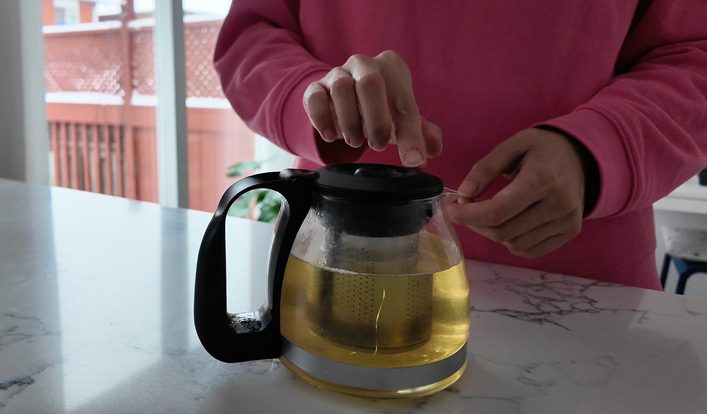 This is the jasmine tea I just bought. To make hot tea, I use a teapot. When you open the teapot, there is a filter inside.