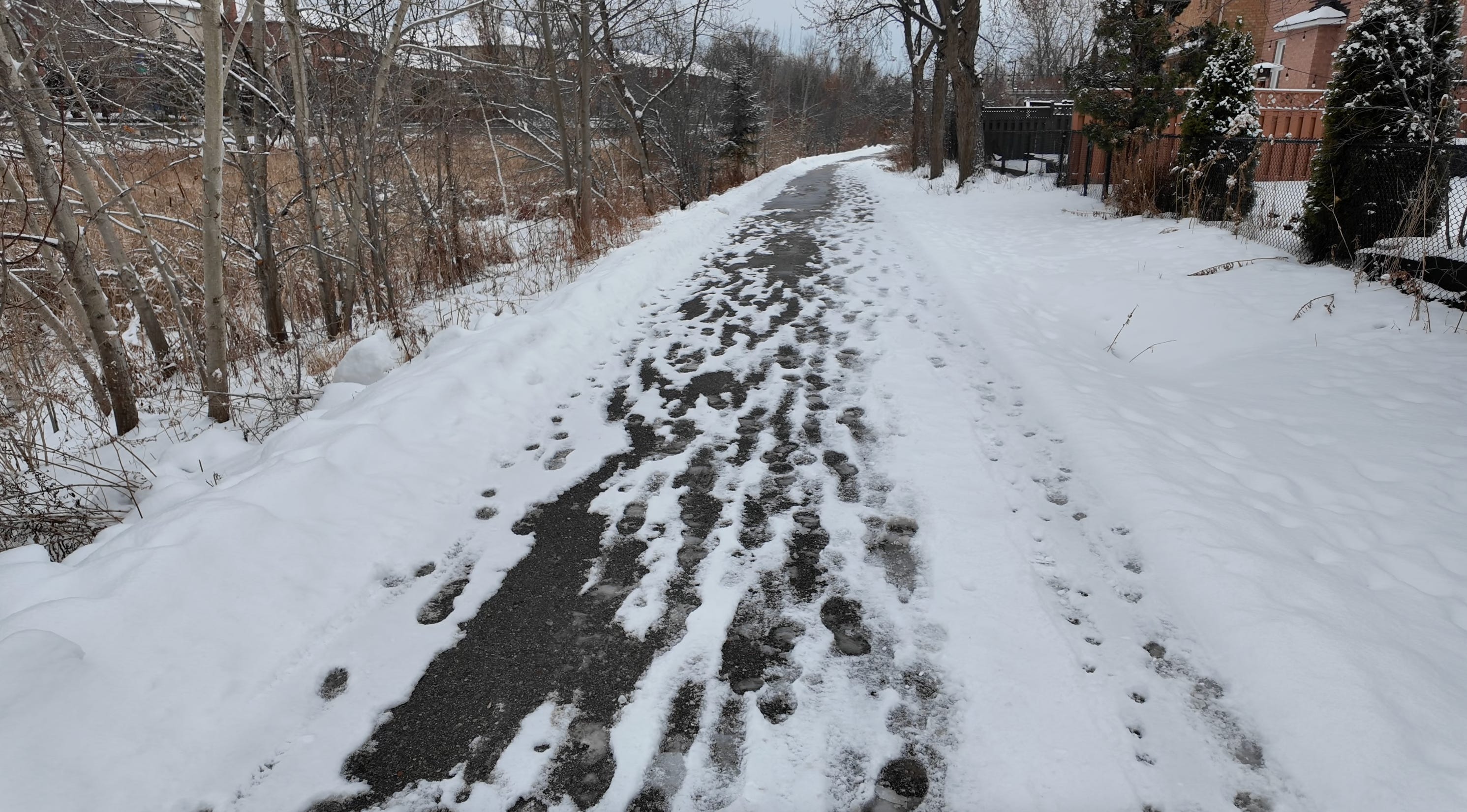 There is a small path behind my home. After it snows, you have to be very careful when walking here. There is a lot of snow on the ground, and it needs to be cleared.